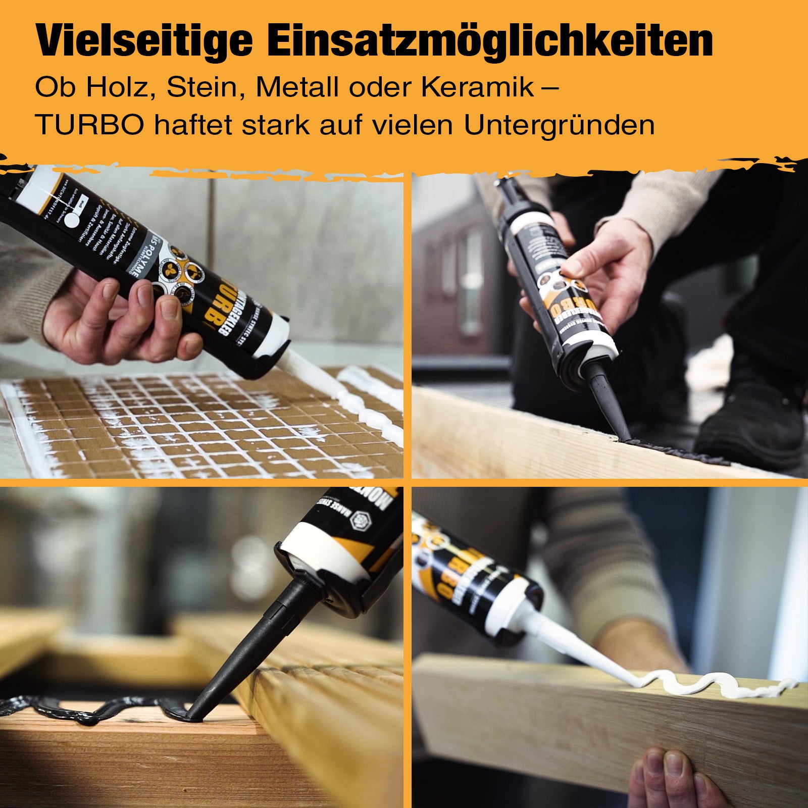 ✅ Vielseitig einsetzbar: Der Montagekleber TURBO haftet zuverlässig auf nahezu allen Untergründen im Innen- und Außenbereich, egal ob auf Holz, Stein, Keramik oder Metall.
